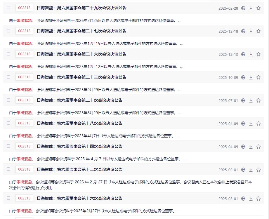 2月27日晚间,日海智能(维权)(SZ002313)披露公告称,公司董事会于当日因“事出紧急”召开会议,授权副董事长代行总经理职责。《每日经济新闻》记者梳理发现,自2025年2月以来,该公司已累计9次以“事出紧急”为由突击召开董事会、监事会,审议内容涵盖关联交易、人事变更、资产处置等事项。更有个别会议是召开当天才递送会议材料。